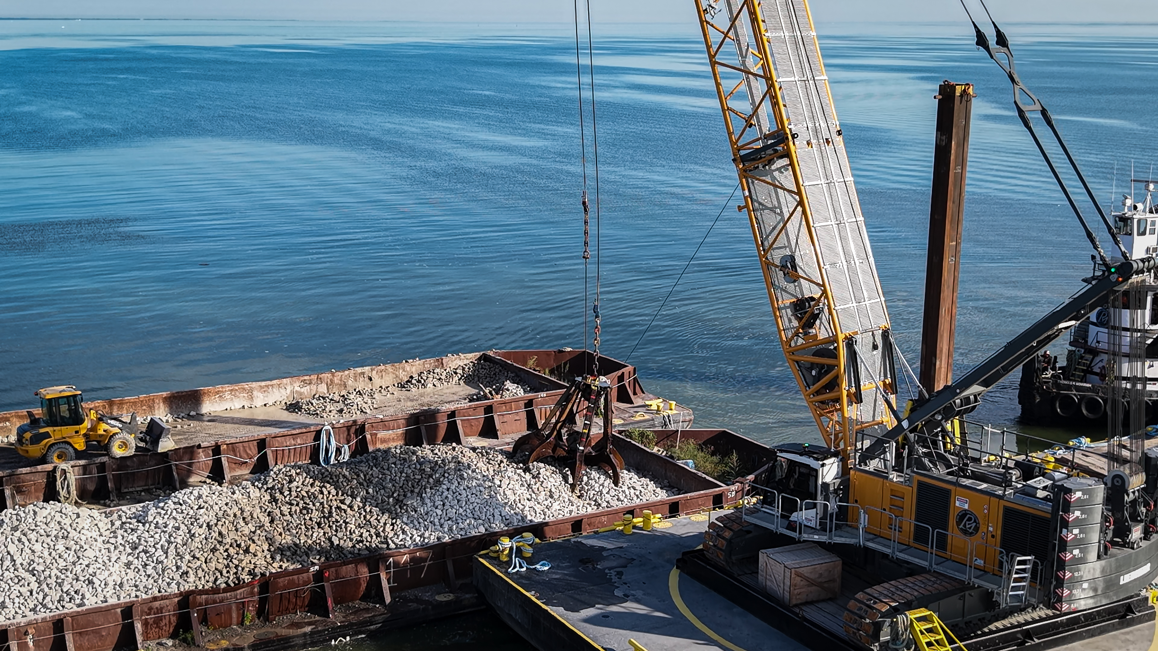 To imagine the size of the new reef, picture two football fields placed end-to-end, with a player buried chest-deep in softball-to-volleyball size rock! The total volume is about the size of a large concert hall. To create this massive structure, a whopping 40 barge loads of limestone were needed and crews ran 24/7 during project construction. The stone was installed on the bay bottom using a grapple attachment on a crane, like the toy claw machine in an arcade. Because the grapple attachment was so large (~15 feet tall), the limestone was essentially placed—not dropped—on the bottom. This allowed for precision placement of the material to obtain uniform depths and meet design plans and specifications.